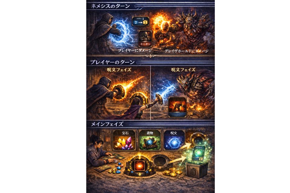 - メインフェイズ:カードの獲得、呪文のセット、破孔の強化・開放などなどを行える状況のこと。
